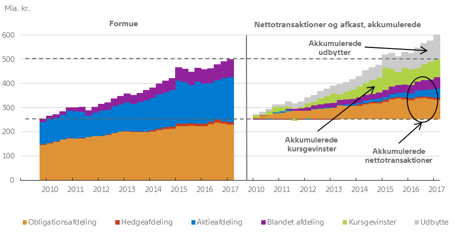 Husholdningernes formue i investeringsforeningerne nåede i 1. kvartal 2017 op på næsten 500 mia. kr. – en fordobling på syv år. Af de 500 mia. kr. udgør obligationsafdelingerne godt 46 pct., mens aktieafdelingerne og de blandede afdelinger udgør henholdsvis 37 og 15 pct. Hedgeafdelinger, der blev introduceret i 2004, udgør fortsat blot 2 pct. af den samlede formue. De seneste kvartaler har husholdningerne nedbragt deres investeringer i obligationsafdelingerne og modsat øget deres investeringer i de øvrige afdelingstyper.