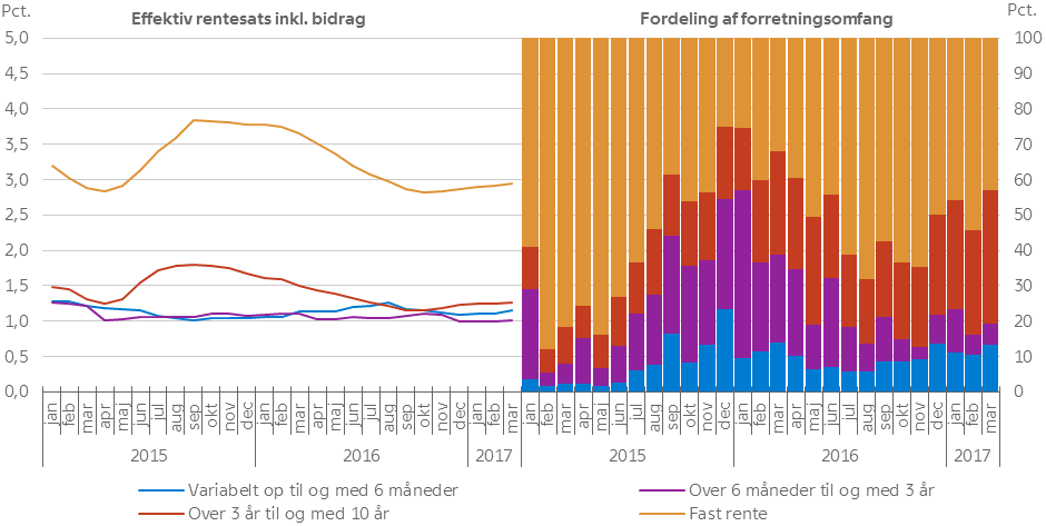 Udviklingen i rente- og bidragssatser har stor betydning for danskernes valg af realkreditlån. Siden udgangen af 2016 har prisen på et fastforrentet realkreditlån været svagt stigende. Det har medvirket til at flytte en del af efterspørgslen efter nye lån over mod især lån med rentebinding på 5-10 år, hvor den effektive rente inkl. bidrag siden efteråret 2016 har ligget stabilt på stort set samme niveau som lån med kortere rentebinding. Fra foråret 2015 og året ud var der en tilsvarende, men betydeligt stærkere bevægelse væk fra fastforrentede lån. Årsagen var dengang, at spændet mellem prisen på fastforrentede lån og prisen på lån med rentebinding på op til og med 3 år blev udvidet med godt 1 procentpoint i løbet af blot fire måneder.
