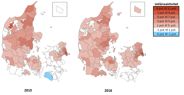 De danske husholdninger optager fortsat nye realkreditlån i deres ejerboliger og fritidshuse. På landsplan er udlånsaktiviteten (nettonyudlånet som andel af udestående lån) således steget fra 2015 til 2016. Udviklingen understøttes af stigende ejendomspriser, nybyggeri og fortsat lave realkreditrenter. Udlånsaktiviteten er i 2016 geografisk set bredere funderet end den var i 2015, så der nu også ses begyndende aktivitet i Sønderjylland, Vest- og Sydsjælland samt på Bornholm.