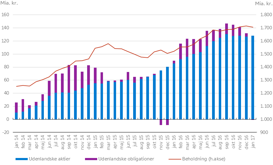 Opbygningen af pensionsformuerne indebærer, at pensionsselskaberne har et stort placeringsbehov. De senere års lavrentemiljø har fået selskaberne til at koncentrere deres udenlandske investeringer på aktier. Siden begyndelsen af 2014 har de under ét købt udenlandske aktier for 128 mia. kr., mens køb og salg af udenlandske obligationer har opvejet hinanden. En del af de udenlandske aktiekøb sker gennem mandater hos danske kapitalforeninger. Ved udgangen af januar 2017 ejede pensionsselskaber udenlandske værdipapirer for 1.706 mia. kr. Det er ca. 60 pct. af Danmarks samlede beholdning af udenlandske porteføljeinvesteringer. |