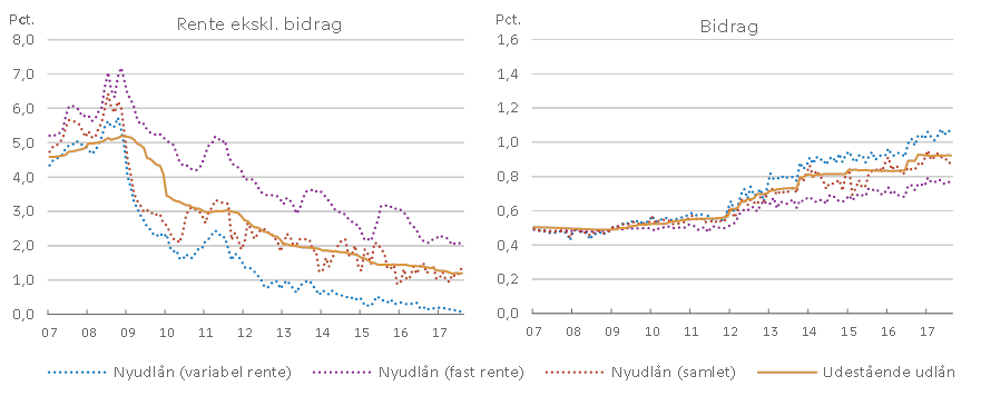 Den gennemsnitlige rente ekskl. bidrag på husholdningernes realkreditlån fortsætter med at falde. I august 2017 lå den således på 1,20 pct. for udestående lån og 1,37 pct. for nye lån. Den del af de nye lån, som er variabelt forrentede med kortere eller længere rentebinding, har en gennemsnitlig rente på rekordlave 0,03 pct. Den tilsvarende rente på de nye realkreditlån med fast rente var 2,04 pct. De månedlige udsving i den gennemsnitlige rente på nye lån afspejler i høj grad, hvordan de forskellige låntyper er sammensat med hensyn til rentebinding, afdrag, belåningsgrad mv.