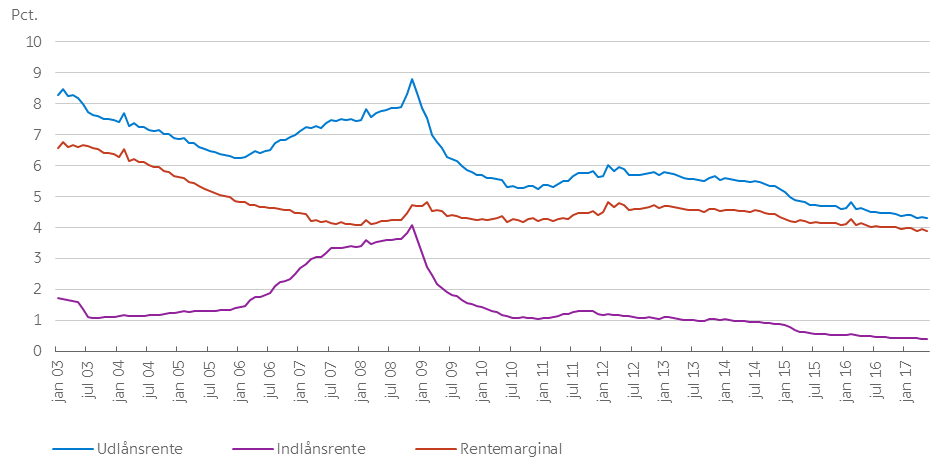 Bankernes rentemarginal over for husholdninger, som er forskellen mellem den gennemsnitlige ud- og indlånsrente, ligger på 3,90 pct. i maj. Det er det laveste i en årrække, og lavere end før finanskrisen. Rentemarginalen følger bl.a. risikoen for tab på udlån; derfor falder den typisk i en højkonjunktur og stiger i en lavkonjunktur.