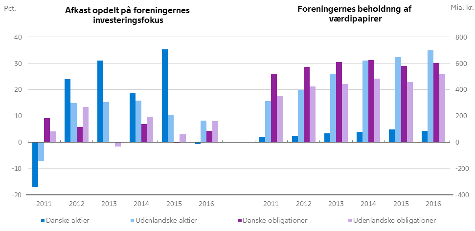 I 2016 har private og institutionelle investorer for første gang i fem år opnået et højere afkast i både aktie- og obligationsafdelinger med udenlandsk fokus sammenlignet med afdelinger, der har dansk fokus. Således fik investorerne et afkast på henholdsvis 8,4 og 8,1 pct. i afdelinger med fokus på udenlandske aktier og obligationer sammenlignet med henholdsvis -0,7 og 4,4 pct. i afdelinger med fokus på danske aktier og obligationer. I de foregående fire år har investeringerne i danske aktier – drevet af aktier i det danske C20-indeks og særligt Novo Nordisk – konsekvent slået de udenlandske porteføljer. Danske aktier udgør dog kun en relativt lille andel af de samlede investeringsporteføljer.
