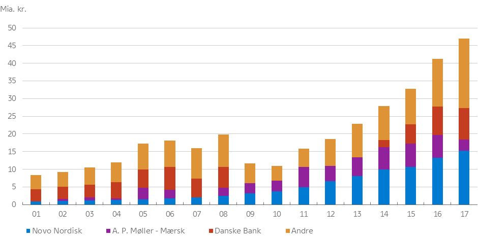 Anm.: Udbyttesæsonen er traditionelt fra januar til april, men der er korrigeret for, at A.P. Møller – Mærsk i 2001-04 og 2007-09 udbetalte udbytte i maj. Novo Nordisk valgte fra og med august 2016 at udbetale udbytte halvårligt, og af hensyn til sammenlignelighed er dette udbytte inkluderet i tallet for januar-april 2017. Følgende ekstraordinære udbytter indgår ikke i datagrundlaget: TDC med 43,5 mia. kr. i 2006, ØK med 7,7 mia. kr. i 2006 og A.P. Møller - Mærsk med 36,7 mia. kr. i 2015.