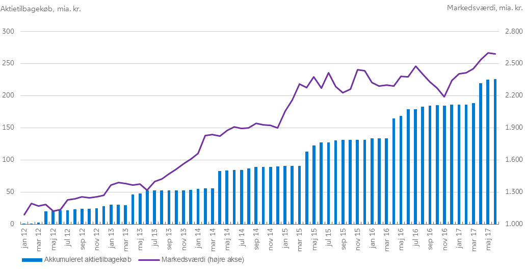 Siden begyndelsen af 2012 har de børsnoterede selskaber brugt godt 225 mia. kr. på at købe aktier tilbage, heraf står 15 af de største danske selskaber for ca. 80 pct. af tilbagekøbet. Alene det seneste år har danske selskaber opkøbt egne aktier for knap 47 mia. kr.