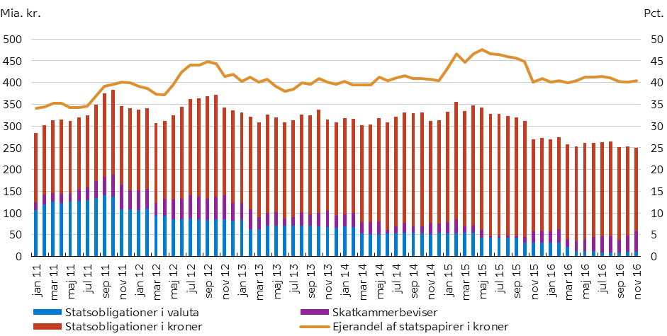I november udløb statsobligationen 2,5 pct. Danske Stat St. lån 2016, hvor udenlandske investorer ultimo oktober holdt for nominelt 17,3 mia. kr. En stor del er dog blevet genplaceret i skatkammerbeviser og statsobligationer med under 5 års restløbetid. Skatkammerbeviser er typisk populære hos udenlandske investorer, og deres gennemsnitlige ejerandel fra januar til november 2016 har været 89 pct.