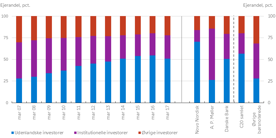 Udenlandske investorer har igennem de sidste ti år vist stor interesse for danske aktier og købt for 275 mia. kr. Deres ejerandel af børsnoterede danske aktier er steget fra 27 pct. i 2007 til 51 pct. i marts 2017, svarende til en markedsværdi på 1.251 mia. kr. Aktier i C20-indekset udgør knap 90 pct. af deres aktieportefølje.