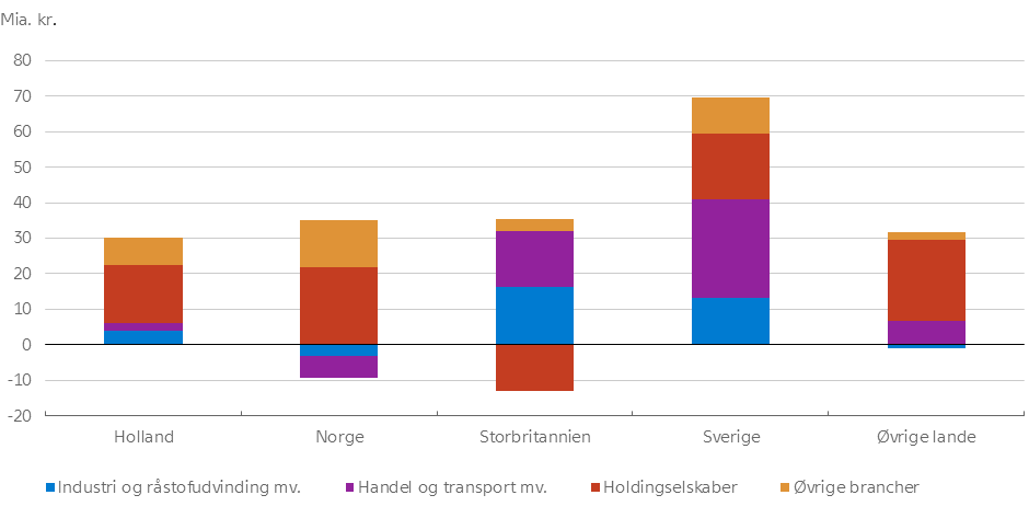 Direkte investeringer fra Sverige og Storbritannien er fortrinsvist foretaget i dansk industri og råstofudvinding samt handels- og transportvirksomheder, mens investeringerne fra Norge i højere grad har været målrettet øvrige brancher, såsom forsikring og fast ejendom. Udlandets investeringer – fra især Holland, Sverige og Norge – bliver også i stadig højere grad placeret i danske holdingselskaber. Set over perioden udgør holdingselskaber 37 pct. af de samlede direkte investeringer i Danmark. Holdingselskaber dækker dog typisk over ejerskab af virksomheder i andre brancher, og det skønnes, at ca. halvdelen af udlandets investeringer i danske holdingselskaber er blevet overført til enten industri- eller handels- og transportvirksomheder.