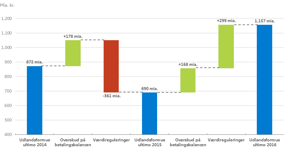 Set over hele 2016 steg udlandsformuen med 467 mia. kr. Det er den største årlige stigning nogensinde. Overskuddet på betalingsbalancen bidrog med 168 mia. kr., mens værdreguleringer af Danmarks aktiver og passiver trak yderligere op med 299 mia. kr. Danmarks passiver blev i 2016 især reduceret af kursfald på udlandets beholdning af danske aktier. Novo Nordisk-aktien faldt med 36 pct. over året, og med en udenlandsk ejerandel på over 70 pct. bidrager den alene til stigningen i udlandsformuen med omkring 200 mia. kr.