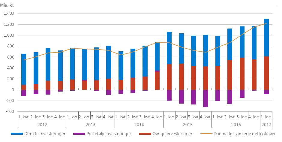 Danmarks udlandsformue udgjorde 1.215 mia. kr. ved udgangen af 1. kvartal 2017. Det er femte kvartal i træk, at danske nettoaktiver over for udlandet stiger som følge af overskud på betalingsbalancen og værdireguleringer. I 1. kvartal bidrog overskud på betalingsbalancen med 33 mia. kr. og positive værdireguleringer på bl.a. udenlandske aktier med 28 mia. kr.