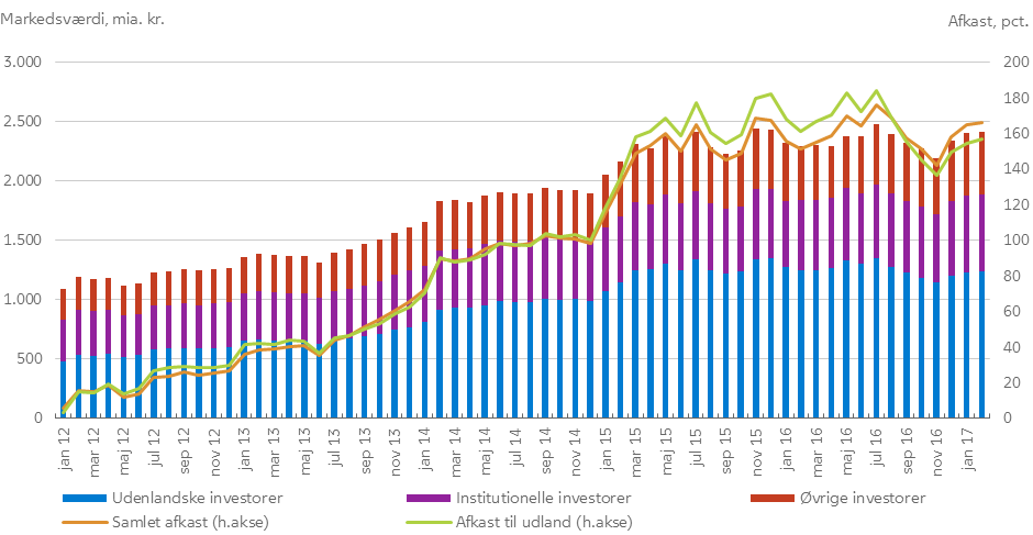 Den samlede markedsværdi af børsnoterede danske aktier er siden begyndelsen af 2012 steget med 1.383 mia. kr., svarende til 134 pct. De fem største børsnoterede selskaber – Novo Nordisk, A.P. Møller - Mærsk, Danske Bank, Vestas og Coloplast – tegner sig for halvdelen af stigningen. Samlet set har danske børsnoterede selskaber i perioden givet et afkast på 166 pct. i form af værdistigninger og udbytter.
