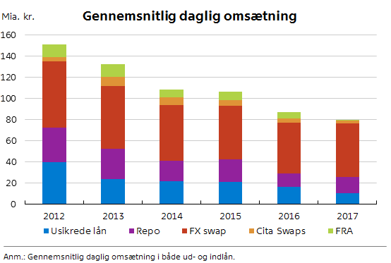 Den samlede omsætning i danske pengemarkedslån var ifølge Nationalbankens årlige pengemarkedsundersøgelse fortsat på et lavt niveau i 2. kvartal 2017. Ligesom de seneste år skal den beskedne omsætning ses i sammenhæng med den rigelige kronelikviditet for bankerne som helhed.