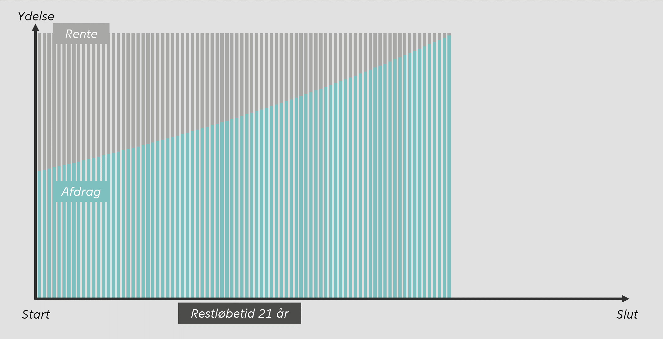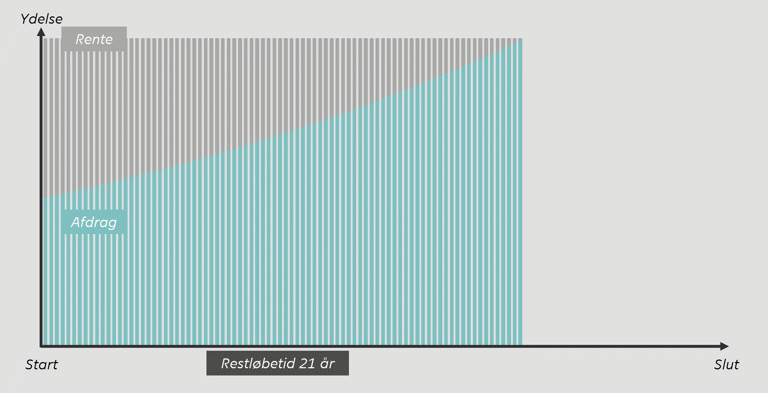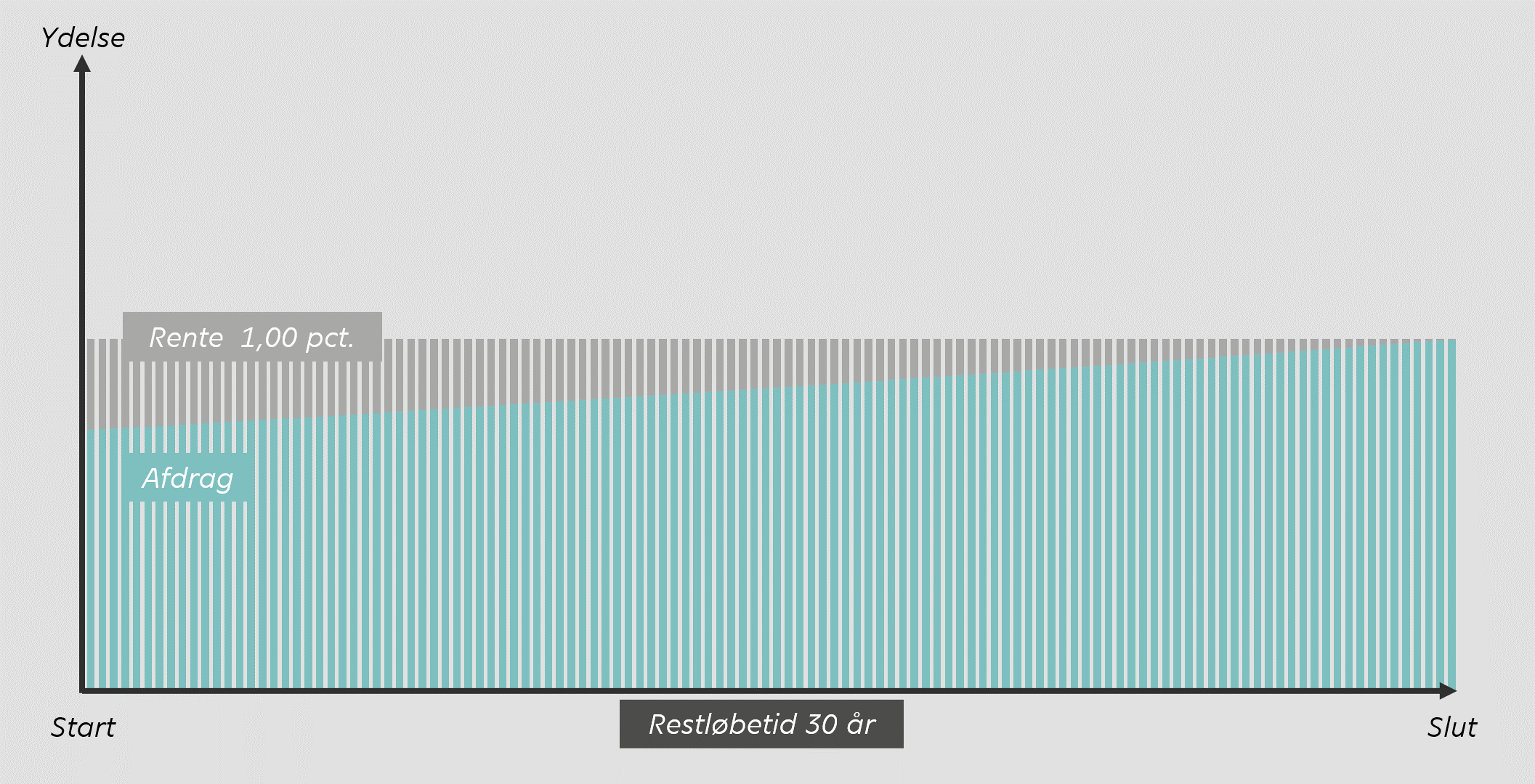 Figuren viser et stiliseret eksempel på, hvordan ydelsen (rente- og afdragsbetalinger) på et realkreditlån ændrer sig, når restløbetiden ændrer sig. I eksemplet er der for enkelhedens skyld set bort fra bidragsbetalinger, som lægges oven i ydelsen.