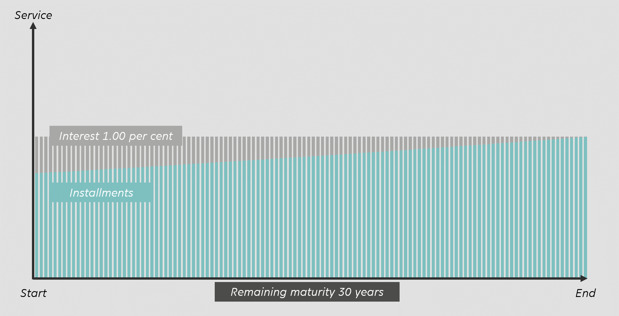 The figure shows a stylized example of how the service (interest and installments) on a mortgage loan changes when the interest rate changes without changing the remaining maturity. For the sake of simplicity, the example ignores administration fee payments, which are added to the service.