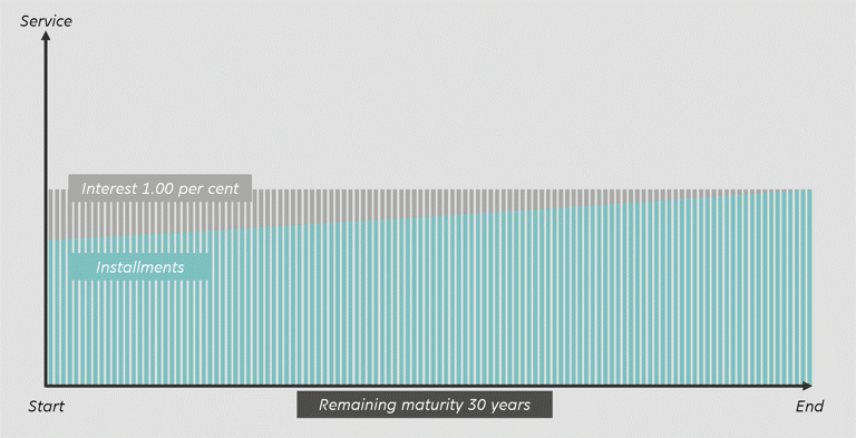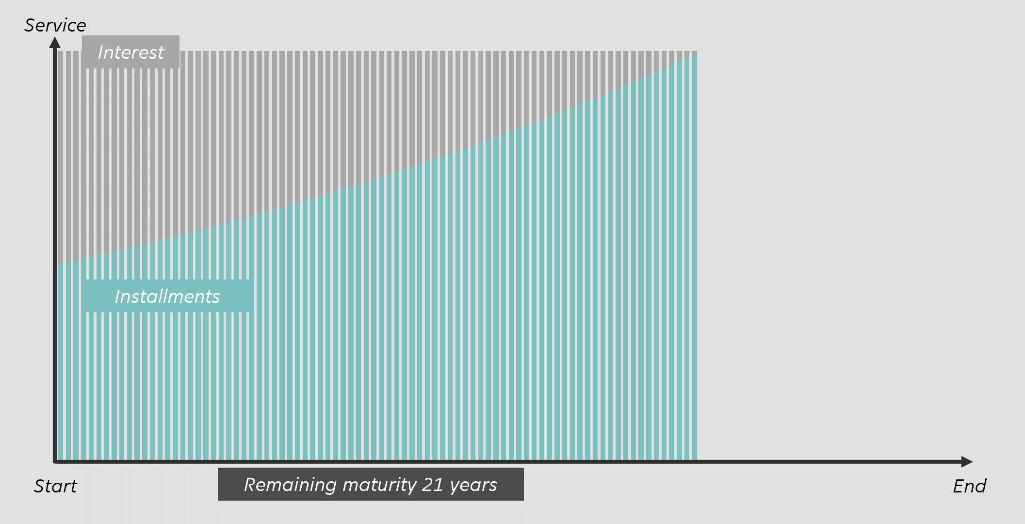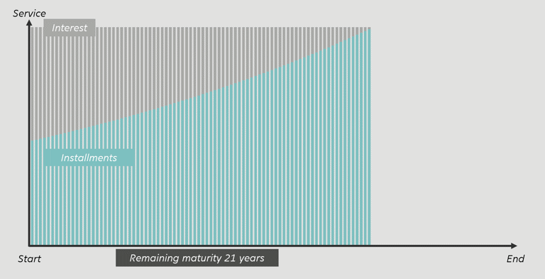 The figure shows a stylized example of how the service (interest and installments) on a mortgage changes when the remaining maturity changes. For the sake of simplicity, the example ignores administration fee payments, which are added to the service.